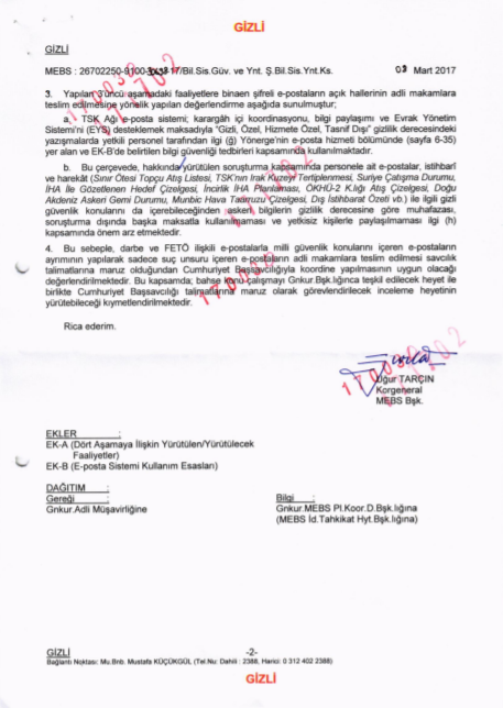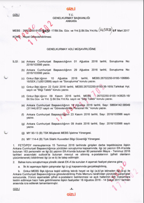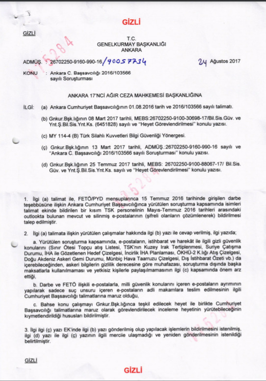 Koskun ordered the army to forward copies of all emails for the previous two months, including the encrypted ones, on August 1, 2016. Ten days later, on August 11, 2016, the prosecutor instructed his trusted assistant, a police officer named Yüksel Var, collect emails from the General Staff’s internal servers and report to him. A panel set up by military technicians under Var completed its work on 14 February 2017. Finally, the indictment filed by prosecutors Necip Cem İşçimen, Kemal Aksakal and İstiklal Akkaya in March 2017 at the 17th Supreme Criminal Court of the All of Ankara the e-mails collected from the computers of the General Staff “.