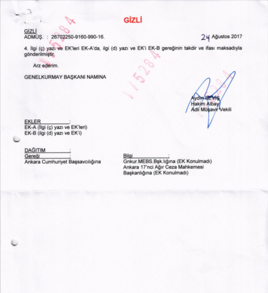 He warned the General Staff Legal Service that the documents contained secret documents related to Turkey’s national security, classified intelligence reports and operations in Syria and the eastern Mediterranean. He said the documents should be kept secret and not disclosed to unauthorized persons. The Deputy Chief Legal Adviser of the General Staff, Colonel Aydın Seviş, then wrote to the 17th Ankara High Criminal Court on 24 August 2017, reiterating the same concerns about the secret documents and urging the establishment of a committee to review them. However, the Turkish prosecutors did not seem to pay attention to their concerns and included all the emails with the attached secret documents in the case file, revealing the highly classified information including the name of the invasion plan for Greece”.