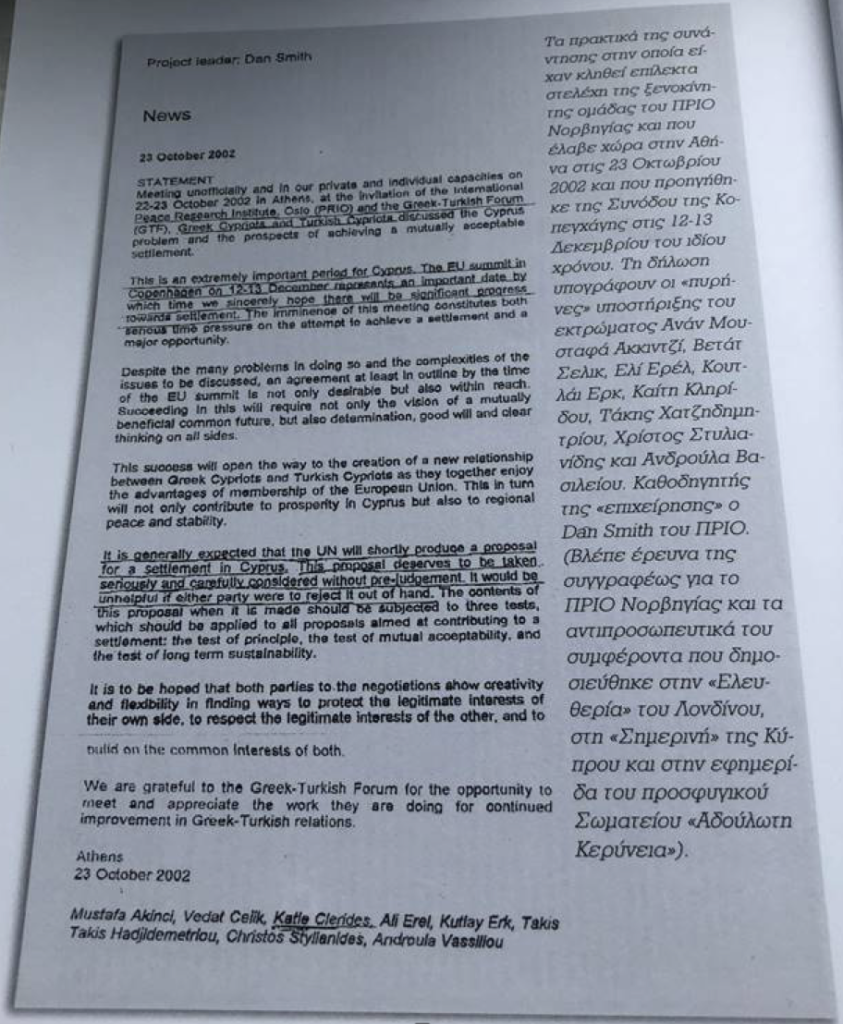 «Ανεπίσημη συνάντηση υπό την ιδιωτική μας υπόσταση μεταξύ 22-23 Οκτωβρίου, 2003, στην Αθήνα με την πρόσκληση του Διεθνούς Ερευνητικού Ινστιτούτου για Ειρήνη, του Όσλο και του Ελληνο-τουρκικού Φόρουμ. Ελληνοκύπριοι και Τουρκοκύπριοι συζήτησαν το Κυπριακό πρόβλημα και τις προοπτικές επιτυχίας μιας κοινώς αποδεκτής λύσης.