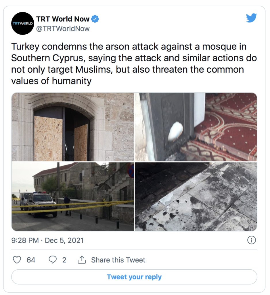Άλλο τουρκοκυπριακό προπαγανδιστικό μέσο στο Twitter (@Young_Turk_Cyp, 05/12/2021) προσπάθησε να συσχετίσει την επίθεση με τη συμβολική αναφορά του Αρχιεπίσκοπου Κύπρου Χρυσόστομου Β’ κατά την προσφώνηση προς τον Πάπα Φραγκίσκο.