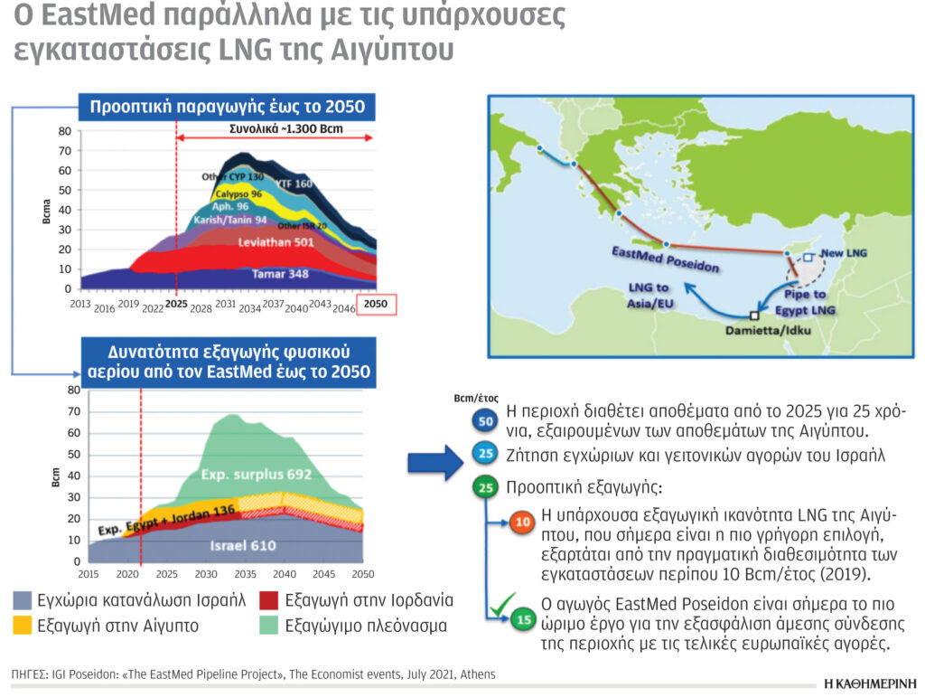 Ο EastMed δεν ανταγωνίζεται τις υποδομές της Αιγύπτου. Σύμφωνα με την εταιρεία μελετών IHS, η παραγωγή των κοιτασμάτων Ισραήλ και Κύπρου, έως το 2050, θα φτάσει τα 1.300 bcm, ενώ το πλεόνασμα προς εξαγωγή θα είναι 692 bcm. Τα διαθέσιμα κοιτάσματα της περιοχής για το διάστημα 2025-2050 (χωρίς την Αίγυπτο) είναι 50 bcm/έτος. Τα 25 bcm/έτος για εσωτερική κατανάλωση του Ισραήλ και γειτονικών αγορών. Τα 25 bcm/έτος μπορούν να κατανεμηθούν στα 10 bcm/έτος για τις υποδομές LNG της Αιγύπτου και 15 bcm/έτος για τον EastMed.