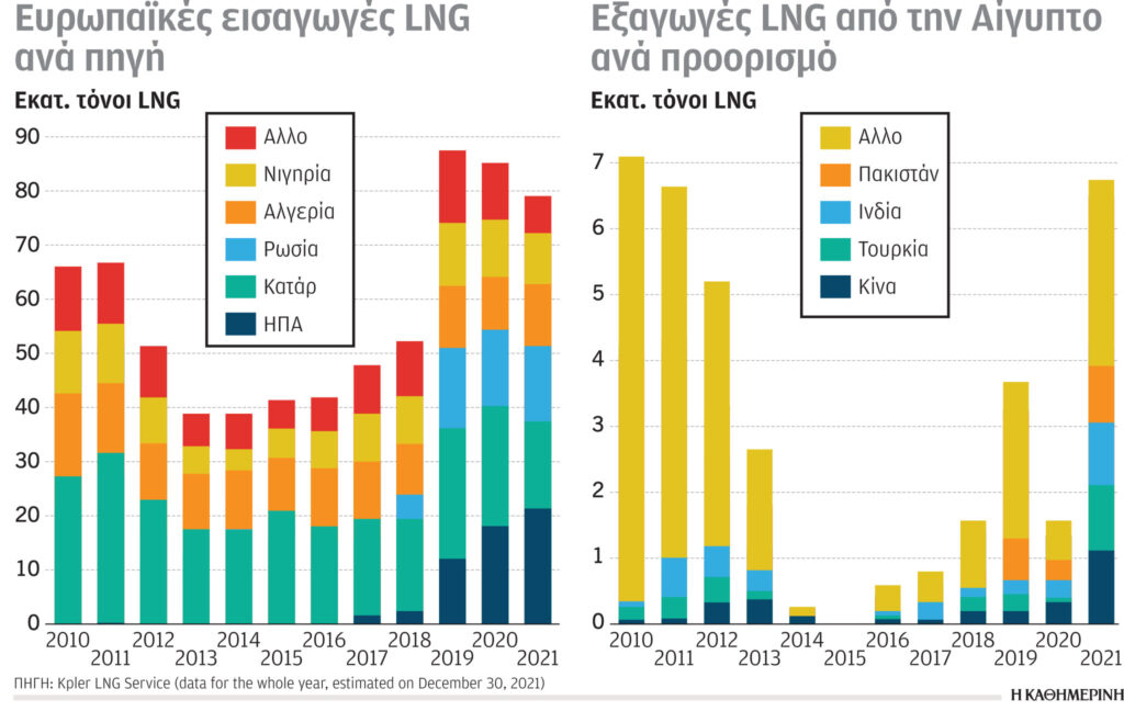Οι εισαγωγές LNG στην Ε.Ε. βαίνουν διαρκώς αυξανόμενες την τελευταία δεκαετία. Εντυπωσιάζει η εκτόξευση των εισαγωγών από τις ΗΠΑ τα τελευταία τρία χρόνια. Αποκαλυπτικό είναι και το διάγραμμα εξαγωγών LNG από την Αίγυπτο. Σε καμία περίπτωση δεν μπορεί να θεωρηθεί ότι οι μονάδες αυτές θα τροφοδοτούν κυρίως την Ε.Ε. υποκαθιστώντας τη χρησιμότητα του EastMed, δεδομένου ότι τα φορτία τους κατευθύνονται στις αγορές με τις υψηλότερες τιμές. Το 2021 η Τουρκία ήταν ο δεύτερος βασικός προορισμός του αιγυπτιακού LNG, με την Κίνα, την Ινδία και το Πακιστάν να είναι επίσης οι βασικές χώρες εξαγωγών από την Αίγυπτο.