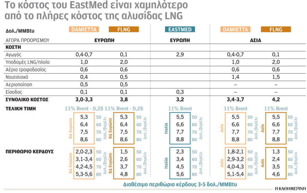 Σύμφωνα με μια πρόσφατη μελέτη, την οποία παρουσίασε ο διευθύνων σύμβουλος του αγωγού EastMed, Pierre Vergerio, κατά τη διάρκεια του τελευταίου συνεδρίου του «The Economist – 25th Round Table with the Government of Greece» (το οποίο πραγματοποιήθηκε τον Ιούλιο του 2021), το διαθέσιμο περιθώριο κέρδους των 3 έως 5 δολαρίων/MMBtu, το οποίο μπορεί να προσφέρει ο νέος αγωγός φυσικού αερίου EastMed, αποτελεί απόλυτα ανταγωνιστική επιλογή εξαγωγών για το φυσικό αέριο της περιοχής, συγκρινόμενο με όλες τις άλλες εναλλακτικές λύσεις (όπως η μονάδα LNG