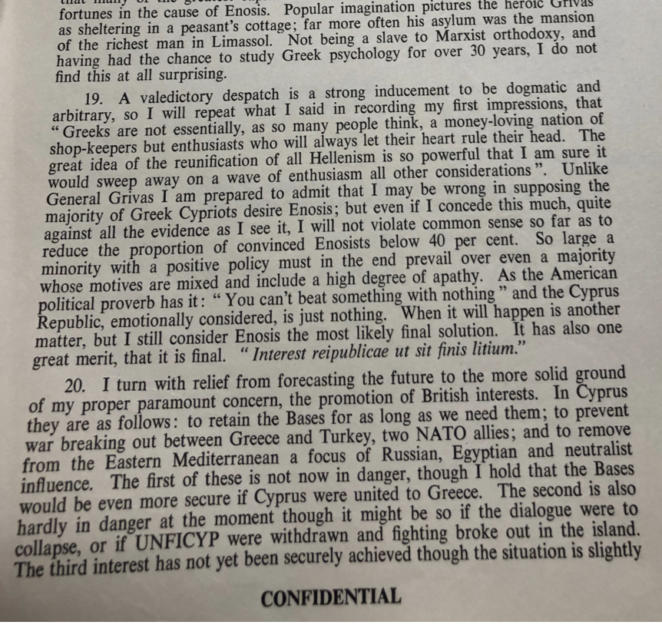 « Συχνά διερωτόμουν πως θα φαίνονταν οι εκθέσεις μου μετά από 30 χρόνια. Γενικά από τα αποσπάσματα που δημοσιεύσατε δεν έχω λόγο να νομίζω ότι περιέπεσα σε λάθος. Πάντα ήμουν υπέρ της Ένωσης έστω και με αποζημίωση… αλλά υπήρχαν Ελληνοκύπριοι με επιρροή που δεν την ήθελαν… οι ίδιοι άνθρωποι υπερ-εκτίμησαν την επιρροή της Κύπρου στο παγκόσμιο, πιστεύοντας ότι είχαν πιστούς φίλους στην Σοβιετική Ένωση, τους «αδέσμευτους»… όπως φαίνεται και από ένα απόσπασμα μου που γράψατε, για την Σοβιετική Ένωση η Τουρκία ήταν πολύ πιο χρήσιμη από την Ελλάδα και Κύπρο μαζί. Τι πρόσφεραν στην Κύπρο οι «αδέσμευτοι»… Ο Μακάριος ήταν αρκετά έξυπνος με δική του πολιτική αποφασισμένος να την ακολουθήσει. Θα έκανε καλύτερα αν έδινε προσοχή στον Μενέλαο Αλεξανδράκη τον εξαίρετο Έλληνα Πρέσβη…»