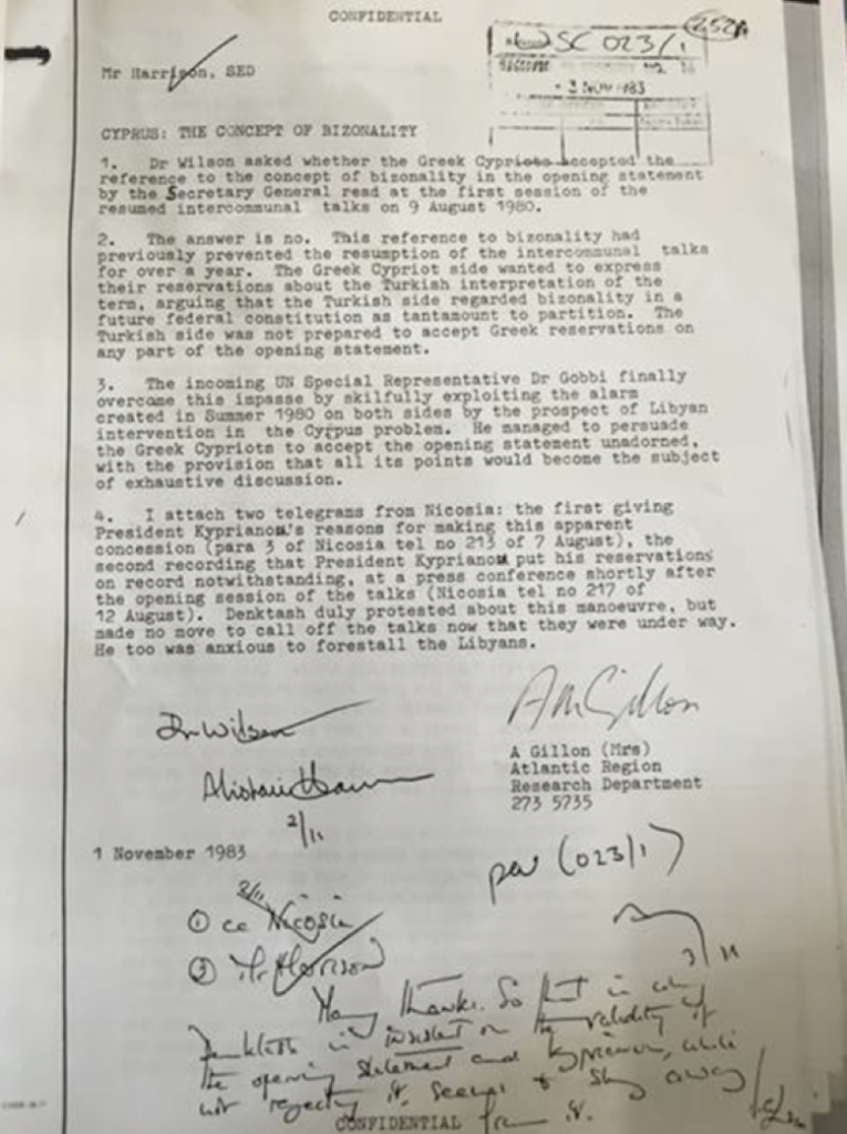 Ρητή διαβεβαίωση από άνθρωπο του Φόρειν ΄Οφις. Την 1η Νοεμβρίου 1983, και δεκατέσσερις μέρες πριν από τη μονομερή ανακήρυξη από τον Ραούφ Ντενκτάς του ψευδοκράτους, η κα Angela Gillon από το τμήμα έρευνας του Φόρεϊν Όφις ρωτήθηκε, αν οι Ελληνοκύπριοι είχαν δεχθεί την έννοια της διζωνικότητας, σε σχέση με την αναφορά του Γενικού Γραμματέα του ΟΗΕ στην πρώτη συνάντηση του νέου γύρου των συνομιλιών στις 9 Αυγούστου 1980. Απάντησε με ένα ξεκάθαρο ΟΧΙ. Γράφει μεταξύ άλλων το σχετικό έγγραφο υπό τον τίτλο «Κύπρος: Η ιδέα της διζωνικότητας».