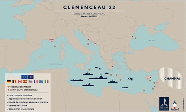Αυτοί είναι οι επίσημοι σχεδιασμοί των Γάλλων για το πρώτο τετράμηνο του 2022. Τα μεγάλα «χρυσά αστεράκια» συνιστούν τα στρατηγικά σημεία προβλεπόμενων ασκήσεων με την κωδική ονομασία «Κλεμανσό 22» από το αεροπλανοφόρο «Σαρλ ντε Γκωλ». Σε αυτά τα «στρατηγικά σημεία» περιλαμβάνονται Κρήτη, Κύπρος, Λίβανος, Ισραήλ και Αίγυπτος, κοντά στο στόμιο του Σουέζ ως σημαντικού “chokepoint”. Κρήτη και Κύπρος, καθώς και Πελοπόννησος περιλαμβάνονται στις «λειτουργικές επιχειρήσεις υποστήριξης», που αποτυπώνονται στο χάρτη με κόκκινα πιο μικρά αστεράκια. Σκοποί της δράσης του «Ντε Γκωλ» και των ασκήσεων με την κωδική ονομασία «Κλεμανσό» είναι: Ο αγώνας κατά της τρομοκρατίας, η αυτόνομη εκτίμηση της κατάστασης, η διασφάλισης της εναέριας και θαλάσσιας κυκλοφορίας, η άμυνα της Ευρώπης και οι στρατιωτικές και στρατηγικές συνεργασίες της Γαλλίας σε διεθνές επίπεδο. Στοιχεία, τα οποία είναι σημαντικά για την υλοποίηση της «στρατηγικής πυξίδας».