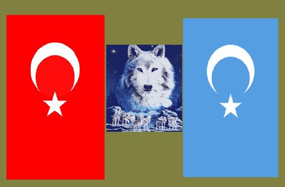 Αριστερά η τουρκική σημαία και δεξιά των Ουιγούρων, των Τούρκων δηλαδή της Κίνας. Σημειώνεται ότι ο Κεμάλ Ατατούρκ προβληματίστηκε κατά πόσον θα έκανε κόκκινη ή γαλάζια, όπως αυτήν των Ουιγούρων, τη σημαία του νέου τουρκικού κράτους. Μεταξύ των δύο σημαιών, ο γκρίζος λύκος από τον μύθο του «Εργκενεκόν» και την καταγωγή της τουρκικής φυλής από τις στέπες της Μογγολίας. Και δη τους πρώτους «Τούρκους νομάδες» με την ονομασία Κοκτούρκ ή Γκοκτούρκ, που θα πει «Γαλάζιοι Τούρκοι».