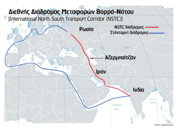 ΣΤΟ ΔΙΑΓΡΑΜΜΑ με κόκκινη γραμμή είναι ο διάδρομος INSTC. Τα ινδικά εμπορεύματα διά θαλάσσης από τη Mumbai, το οικονομικό κέντρο της Ινδίας, μέσω του λιμανιού Chabahar του Ιράν αποβιβάζονται στη στεριά παρακάμπτοντας το Πακιστάν. Εάν δεν υπήρχε ο INSTC, τα εμπορεύματα θα έπρεπε να ακολουθήσουν την μπλε γραμμή, μέσα από τη Διώρυγα του Σουέζ, από το Γιβραλτάρ, τα στενά της Μάγχης και τη Βαλτική θάλασσα για να φθάσουν στη Ρωσία. Με έναν εχθρικό γείτονα όπως το Πακιστάν, που βρίσκεται ανάμεσα στην Ινδία και την περιοχή της Κεντρικής Ασίας, στο παρελθόν η Ινδία δεν μπορούσε να επεκτείνει την εμβέλειά της στην Κεντρική Ασία. Το Πακιστάν δεν αποτελεί πλέον εμπόδιο για την Ινδία από αυτή την άποψη.