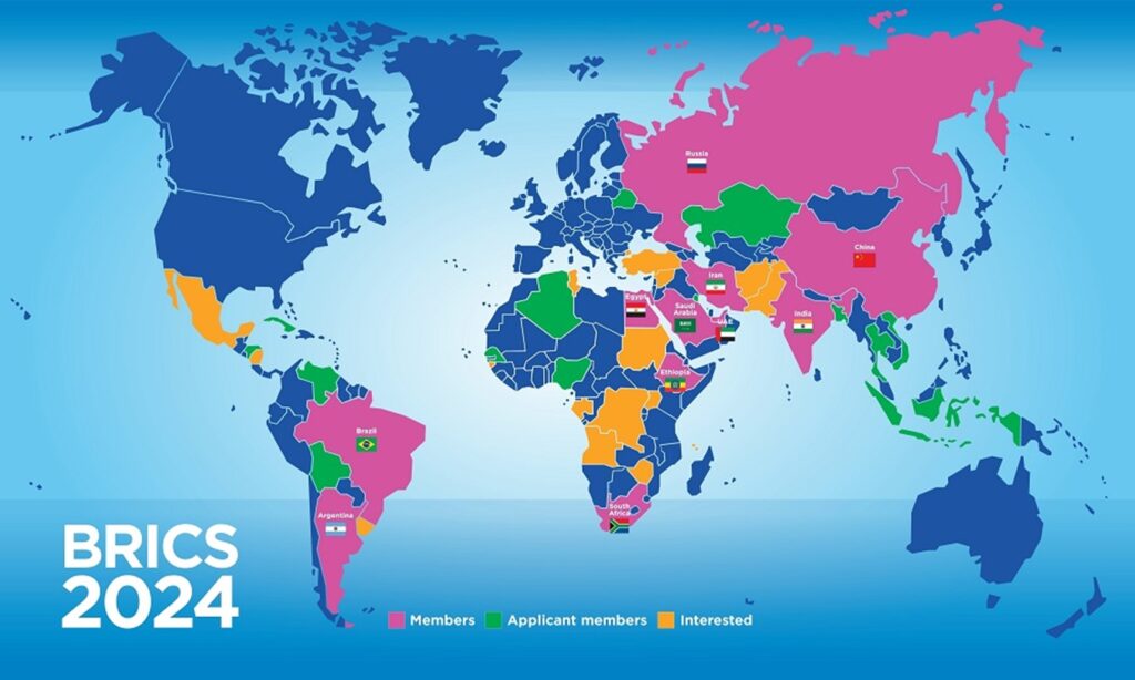 Οι BRICS+, από την 1η Ιανουαρίου 2024: Mε ροζ, τα μέλη, με πράσινο οι δηλωμένοι υποψήφιοι, με κίτρινο, χώρες που ενδιαφέρονται αλλά όχι υποψήφιες ακόμη.