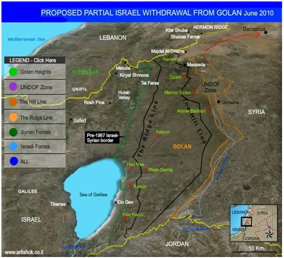 Έτσι το Ισραήλ προτείνει στη Συρία το 2010 την αποχώρηση των ισραηλινών δυνάμεων, μέχρι τη λεγόμενη γραμμή Ridge (Ridge Line), παραχωρώντας στην Συρία, σχεδόν όλο το Γκολάν, μαζί με όλες τις υφιστάμενες κατοικημένες περιοχές. Οι προτάσεις του Ισραηλινού πρωθυπουργού (και τότε ήταν ο Μπέντζαμιν Νετανιάχου) για αποχώρηση μέχρι την γραμμή Ridge, όπως βλέπουμε και στον χάρτη, περιλαμβάνει και την ανατολική όχθη του Ιορδάνη ποταμού και μάλιστα σε απόσταση 2,5 χλμ. από αυτή στα τελευταία Υψώματα του Γκολάν πριν την κοιλάδα του Ιορδάνη ποταμού, την κοιλάδα Χούλα και τη Θάλασσα (λίμνη) της Γαλιλαίας.