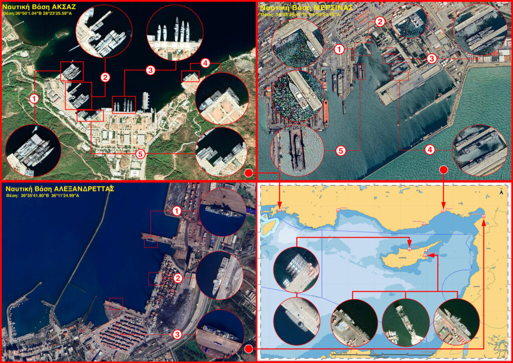 Δορυφορικές φωτογραφίες από τις μεγαλύτερες ναυτικές βάσεις της Τουρκίας απέναντι από την Κύπρο. Οι φωτογραφίες στα δεξιά αποτυπώνουν πολεμικά πλοία τόσο στο λιμάνι της Κερύνειας όσο και της Αμμοχώστου, που αποτελεί το μακρύ χέρι της Τουρκίας στην Ανατολική Μεσόγειο.
