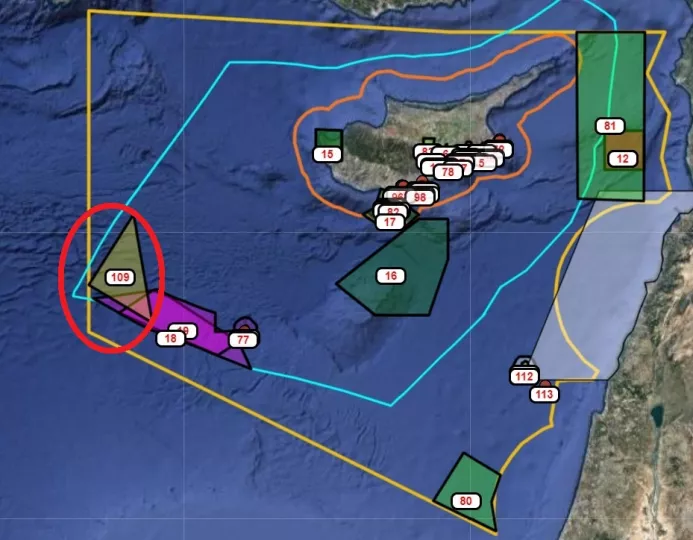 Η περιοχή ερευνών του Meteor εντός της κυπριακής ΑΟΖ δίπλα στο σημείο που εφάπτεται με τη δυνητική ελληνική υφαλοκρηπίδα, που αμφισβητεί η Τουρκία.