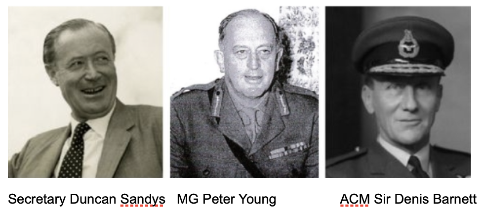 Τα ανώτερα μέλη της Επιτροπής ήταν ο Υπ. Κοινοπολιτειακών Σχέσεων Duncan Sandys, o Major General Peter Young (Commander Land Forces – Διοικητής Δυνάμεων Ξηράς) και o (Στρατάρχης Αεροπορίας) Air Chief Marshal Sir Denis Barnett ( ο οποίος υπηρετούσε ως – Commander in Chief Near East Air Force and Commander British Forces Cyprus – Διοικητής Στρατευμάτων Εγγύς Ανατολής και Βρετανικών Δυνάμεων Κύπρου). Τα άλλα μέλη ήταν ο Βρετανός ΄Υπατος Αρμοστής, οι Πρέσβεις της Ελλάδας και Τουρκίας, αντιπροσωπείες των Ελλήνων και Τούρκων της Κύπρου, οι Διοικητές της ΕΛΔΥΚ και ΤΟΥΡΔΥΚ και ο Colonel (Συνταγματάρχης) John Sale, Σύμβουλος Άμυνας στη Βρετανική Υπάτη Αρμοστεία.