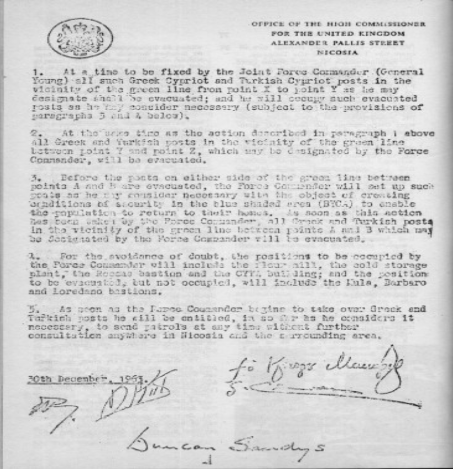 Η Συμφωνία της «Πράσινης Γραμμής» ημερ. 30 Δεκεμβρίου 1963 με πέντε υπογραφές.. Δύο από την ελληνική πλευρά και δύο από την τουρκική. Αφενός των Αρχιεπισκόπου Μακαρίου και Γλ. Κληρίδη, αφετέρου των Φ. Κουτσούκ και Ρ. Ντενκτάς, (εξ όσων πιστεύω), και του Βρετανού Υπουργού Κοινοπολιτειακών Σχέσεων Duncan Sundays από κάτω. (Από το δημοσίευμα του Sigmalive 30.12.2016.)