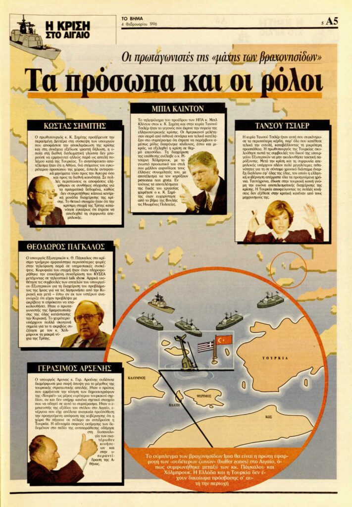 Στις 31 Ιανουαρίου του 1996 κορυφώνεται και ολοκληρώνεται το δράμα της Κρίσης των Ιμίων. Από την τουρκική εισβολή στην Κύπρο (Ιούλιος 1974) και μετά, η Κρίση των Ιμίων ήταν το περιστατικό που έφερε την Ελλάδα και την Τουρκία τόσο κοντά στην εμπόλεμη σύρραξη και αποτέλεσε σαφή προσπάθεια της Τουρκίας να δημιουργήσει γκρίζες ζώνες στο Αιγαίο.