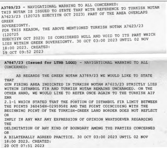 Η Αθήνα ισχυρίστηκε ότι η τουρκική NOTAM ήταν άκυρη καθώς εισέβαλε στον ελληνικό εναέριο χώρο. Η Άγκυρα απάντησε εκδίδοντας μια νέα ΝΟΤΑΜ δηλώνοντας ότι η περιοχή πυροβολισμών βρίσκεται εντός του κυρίαρχου εδάφους της Τουρκίας και υποστηρίζοντας ότι η αρχική ΝΟΤΑΜ παραμένει σε ισχύ.