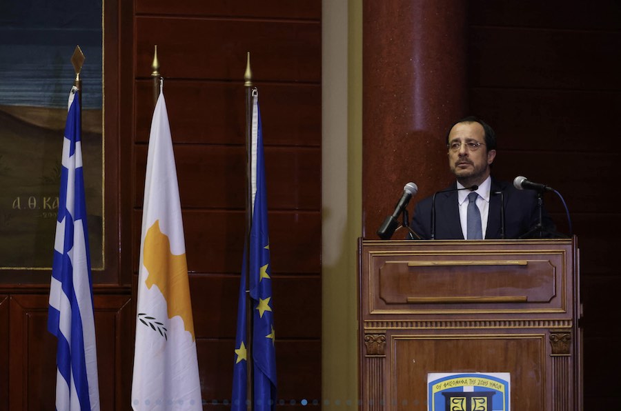 Με αισθήματα χαράς αλλά και ιδιαίτερης τιμής, βρίσκομαι σήμερα στην ιστορική πόλη της Θεσσαλονίκης, για πρώτη φορά ως Πρόεδρος της Κυπριακής Δημοκρατίας, έναν μόνο χρόνο μετά την εκλογή μου. Οι δεσμοί της πατρίδας μου, οι δεσμοί της Κύπρου και του κυπριακού λαού με τη Θεσσαλονίκη, αλλά και την ευρύτερη περιφέρεια της Μακεδονίας είναι, ειδικότερα από την απελευθέρωση της περιοχής το 1912 και 1913, πάρα πολύ ισχυροί. Η παρουσία μου απόψε εδώ σκοπό έχει, ανάμεσα σε άλλα, να δώσει έμφαση σε αυτό το γεγονός, τους ισχυρούς μας δεσμούς, αλλά και να αναγνωρίσει τη συμβολή όλων των Κυπρίων, μόνιμων κατοίκων όπως και των φοιτητών μας, που η ζωντανή και ενεργός τους παρουσία ενισχύει ακόμη περισσότερο τις σχέσεις της Κύπρου με τη Θεσσαλονίκη και ευρύτερα τη Μακεδονία. Βρίσκομαι, λοιπόν, απόψε μαζί σας για να μιλήσουμε για την Κύπρο και τις στενές, τις αδελφικές μας σχέσεις με την Ελλάδα, αλλά και να τιμήσω όλους εσάς που κρατάτε ισχυρούς αυτούς τους δεσμούς, και που με τις δράσεις σας στηρίζετε ουσιαστικά τον αδιάλειπτο αγώνα για την επίλυση του Κυπριακού, για την επανένωση και την απελευθέρωση της πατρίδας μας.