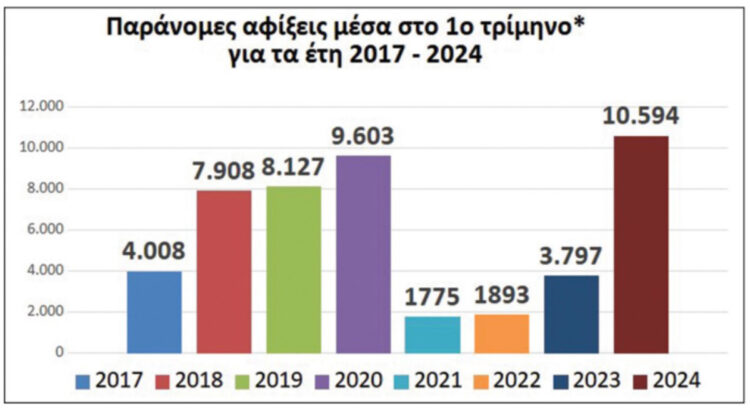 Στόν πίνακα πού παρατίθεται, ὁ ὁποῖος προέρχεται ἀπό τήν Ὑπάτη Ἁρμοστεία τοῦ ΟΗΕ γιά τούς πρόσφυγες, φαίνεται ξεκάθαρα ὅτι στό πρῶτο τρίμηνο τοῦ τρέχοντος ἔτους ἔχουμε τήν μεγαλύτερη ἔκρηξη παρανόμων εἰσόδων μεταναστῶν τῆς τελευταίας ὀκταετίας. Στόν ἀριθμό τῶν 10.594 ἀνῆλθαν οἱ παράνομοι μετανάστες πού εἰσῆλθαν στήν χώρα μας ἀπό τήν 1η Ἰανουαρίου μέχρι τίς 31 Μαρτίου τοῦ τρέχοντος ἔτους. Πέρυσι κατά τό ἀντίστοιχο τρίμηνο ἦσαν μόνον 3.797. Ὁμιλοῦμε γιά σχεδόν τριπλασιασμό (2,7 φορές περισσοτέρους). Πρόκειται γιά ἔκρηξη παράνομων εἰσόδων πού κανονικά θά ἔπρεπε νά εἶχε σημάνει συναγερμό. Καί ὅμως τό ἁρμόδιο ὑπουργεῖο δέν ἀνακοινώνει τά ξεκάθαρα στοιχεῖα τοῦ ΟΗΕ καί θριαμβολογεῖ ἀπομονώνοντας τίς πληροφορίες πού ἐξυπηρετοῦν τό ἀφήγημά του. Ὅπως φαίνεται, ἀκόμη οἱ ἀφίξεις ἦσαν σημαντικά μικρότερες τό 2021 (1775) καί τό 2022 (1893). Προφανῶς μέρος μόνον αὐτῶν προήρχετο ἀπό τήν Τουρκία.