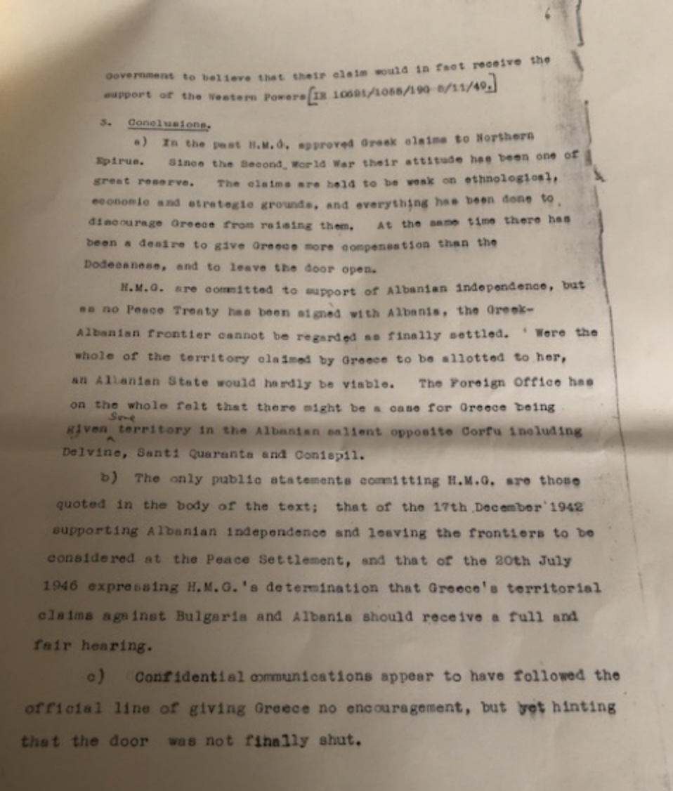 Στο παρελθόν η Κυβέρνηση της Α. Μ υποστήριζε τις ελληνικές διεκδικήσεις στη Β. ΄Ηπειρο. Μετά τον δεύτερο παγκόσμιο πόλεμο η θέση της ήταν επιφυλακτική…υποστήριζε αποζημίωση στην Ελλάδα στα Δωδεκάνησα αφήνοντας την πόρτα ανοικτή. Εφόσον (έγραψαν) δεν υπεγράφη Συνθήκη Ειρήνης με την Αλβανία, το ελληνο-αλβανικό σύνορο δεν μπορεί να θεωρείται ως τελικά διευθετημένο. Μπορεί, (είπαν) τελικά, να υπάρχει θέμα να δοθεί στην Ελλάδα μια αλβανική περιοχή απέναντι της Κέρκυρας περιλαμβανομένων των περιοχών Δέλβινο, Αγίοι Σαράντα και Κονίσπολη.