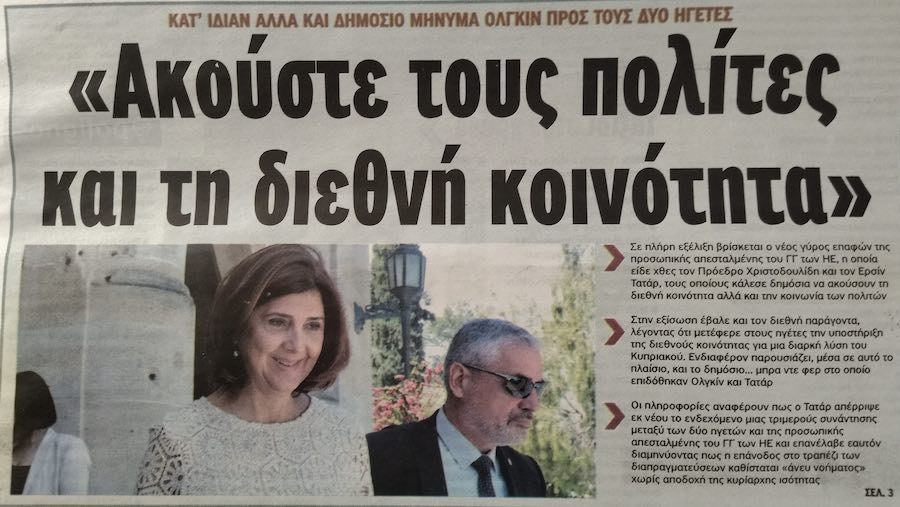 Ήδη αυτές τις μέρες οι Τούρκοι έδειξαν ότι ούτε καν «τριμερή συνάντηση» δέχονται, των «ηγετών των δύο κοινοτήτων» με την ελθούσα στην Λευκωσία απεσταλμένη του Γ.Γρ. του ΟΗΕ, δηλαδή κοινή συνάντηση και συνομιλίες τής Μαρία Άνχελα Ολγκίν Κουεγιάρ με τον επικεφαλής τού ψευδοκράτους Ερσίν Τατάρ και με τον Πρόεδρο τής Κυπριακής Δημοκρατίας Νίκο Χριστοδουλίδη. Η τουρκική άρνηση ωστόσο δεν στάθηκε ικανή να επισύρει αποκλειστικά για τους Τούρκους επίκριση της στάσης τους. Οι δηλώσεις της Ολγκίν Κουεγιάρ την Τετάρτη μετά από τις χωριστές συναντήσεις της με τους Χριστοδουλίδη και Τατάρ προβλήθηκαν ως επίρριψη ΕΞΙΣΟΥ του φταιξίματος στους «δύο ηγέτες». Στο ίδιο παλαιόθεν γνώριμο μοτίβο συνοδευόμενο και πάλιν με επίκληση της… (ποιάς;) «Κοινωνίας των Πολιτών».