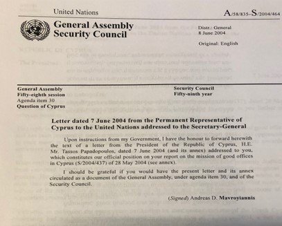 Στις 8 Ιουνίου 2004, ο τότε Μόνιμος Αντιπρόσωπος της Κύπρου στα Ηνωμένα Έθνη, Ανδρέας Μαυρογιάννης (πρόσφατα υποψήφιος για την προεδρία και προηγουμένως διαπραγματευτής της ε/κ πλευράς), προώθησε προς τον Γ.Γ. του ΟΗΕ Kofi Annan επιστολή του Προέδρου της Κυπριακής Δημοκρατίας, Τ. Παπαδόπουλου, ημερ. 7 Ιουνίου 2004 (με συνημμένο έγγραφο), με αριθμό S.2004/437, που αποτελούσε την επίσημη θέση της κυπριακής Κυβέρνησης στην έκθεση του Γ.Γ. του ΟΗΕ για το Κυπριακό, ημερ. 28 Μαΐου 2004. Και ζήτησε η επιστολή του Κύπριου Προέδρου με το συνημμένο έγγραφο όπως κυκλοφορήσουν ως έγγραφα στη Γενική Συνέλευση και στο Συμβούλιο Ασφαλείας. Στην τέταρτη σελίδα της επιστολής (σύνολο σελίδων 8), έγραψε ο μ. Τ. Παπαδόπουλος προς τον K. Annan (σε ελεύθερη μετάφραση):