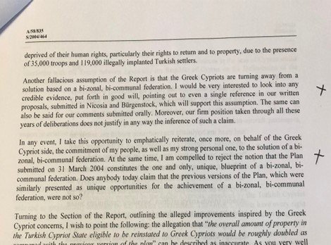 «Ένα άλλο απατηλό συμπέρασμα στην Έκθεση είναι πως οι Ελληνοκύπριοι απορρίπτουν μια λύση βασισμένη στη δι-ζωνική, δι-κοινοτική ομοσπονδία. Ενδιαφέρομαι πολύ να μελετήσω οποιαδήποτε έγκυρη μαρτυρία, που προβάλλεται με καλή πίστη, η οποία να δείχνει έστω και μία αναφορά στις γραπτές μας προτάσεις, που καταθέσαμε στη Λευκωσία και στο Burgenstock, που υποστηρίζει τέτοιο συμπέρασμα. Το ίδιο μπορεί να λεχθεί και για τις παρατηρήσεις μας που δόθηκαν προφορικώς. Ακόμα περισσότερο, οι σταθερές μας θέσεις όλα αυτά τα χρόνια δεν δικαιολογούν σε καμία περίπτωση την αναφορά σε τέτοιον ισχυρισμό. Εν πάση περιπτώσει, δράττομαι της ευκαιρίας να επαναλάβω εμφαντικά γι’ ακόμα μια φορά, εκ μέρους της ελληνοκυπριακής πλευράς, τη δέσμευση του λαού μου, καθώς και την έντονη προσωπική δική μου, για μια λύση διζωνικής, δικοινοτικής ομοσπονδίας. Ταυτόχρονα, αναγκάζομαι να απορρίψω τη θέση ότι το Σχέδιο της 31ης Μαρτίου 2004 συνιστά το μόνο, μοναδικό προσχέδιο μιας διζωνικής, δι-κοινοτικής ομοσπονδίας…». (O τονισμός με μαύρα της γράφουσας).