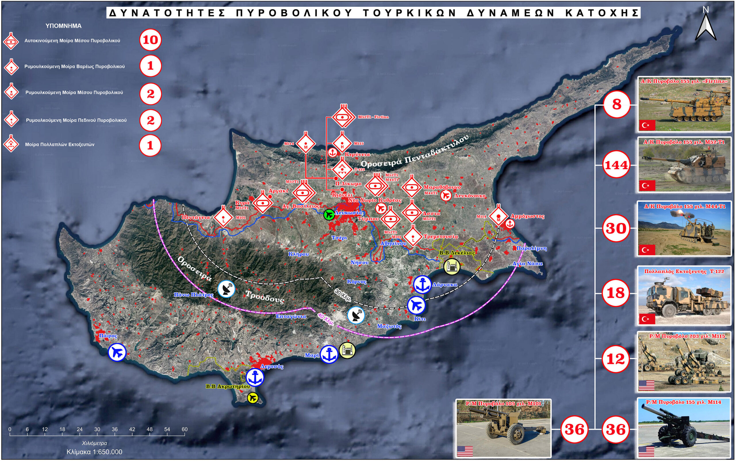 Ο χάρτης είναι αποκαλυπτικός. Απεικονίζει την τουρκική απειλή, όπως αυτή εκδηλώνεται από τις μονάδες του πυροβολικού, που βρίσκονται στα κατεχόμενα και στοχεύουν σε ζωτικούς χώρους, όπως είναι το Λιμάνι Λάρνακας, το Διεθνές Αεροδρόμιο Λάρνακας και περιοχές όπου βρίσκονται στρατόπεδα της Εθνικής Φρουράς.