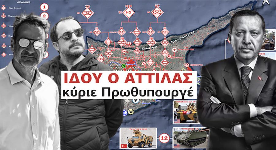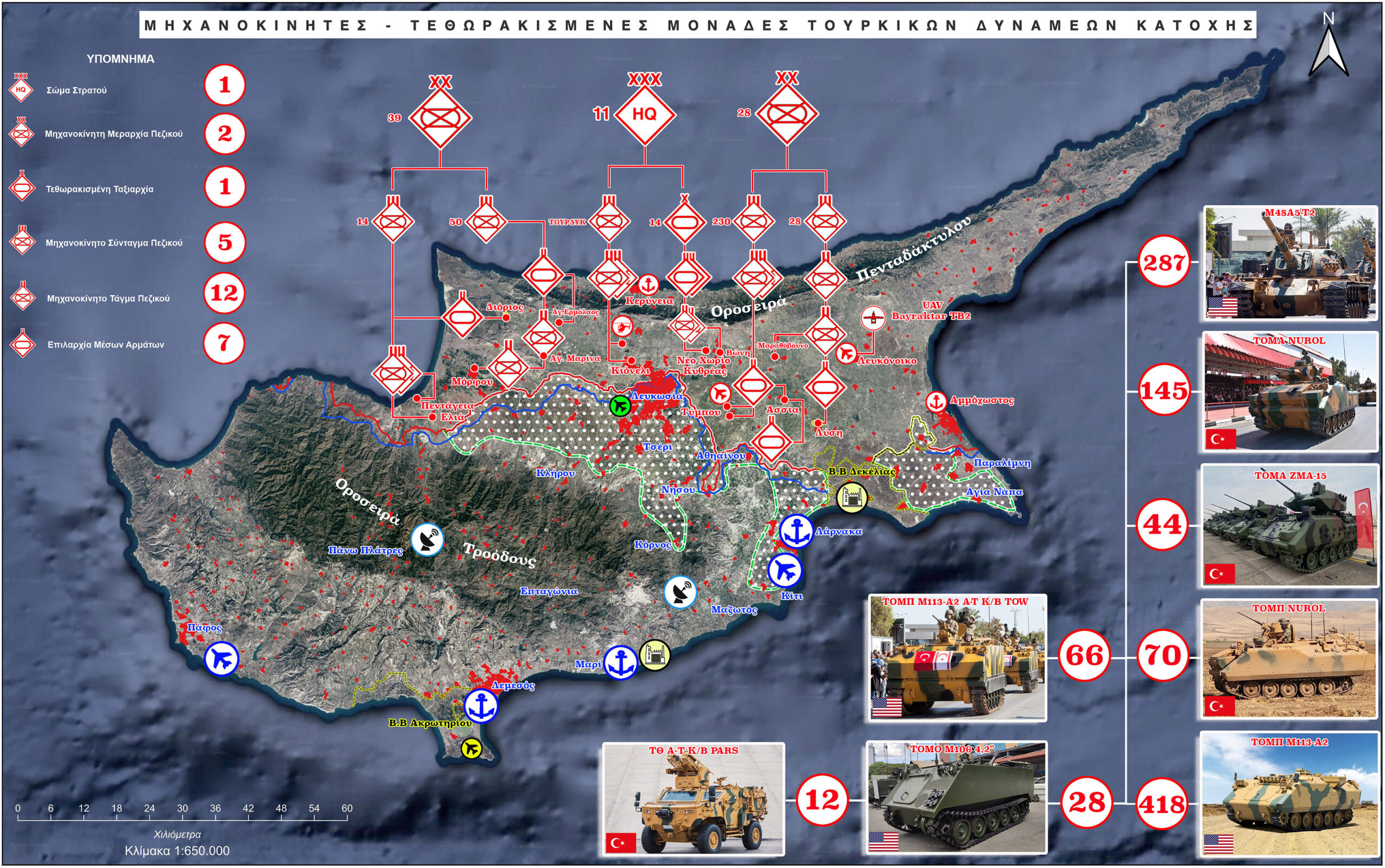 Ο χάρτης αποτυπώνει τη διάταξη των αρμάτων μάχης του Αττίλα και των Μηχανοκίνητων μονάδων πεζικού, που είναι διάσπαρτα στην κατεχόμενη Κύπρο και έτοιμα ανά πάσα στιγμή, με την πρώτη διαταγή, να ξεκινήσουν στρατιωτικές επιχειρήσεις σε βάρος των ελεύθερων περιοχών της Κυπριακής Δημοκρατίας.