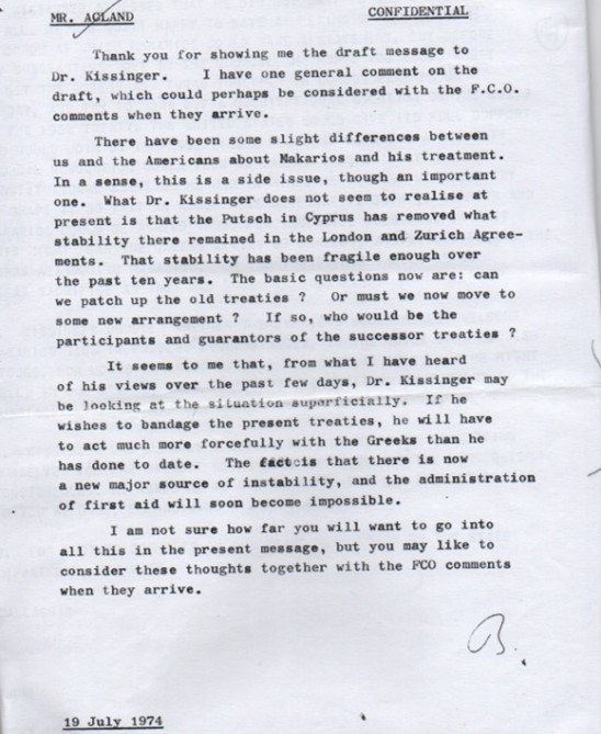 “There have been some slight differences between us and the Americans about Makarios and his treatment. In a sense, this is a side issue, though an important one. What Dr. Kissinger does not seem to realise at present is that the Putsch in Cyprus has removed what stability there remained in the London and Zurich Agreements. That stability has been fragile enough over the past ten years. The basic questions now are: can we patch up the old treaties? Or must we now move to some new arrangements? If so, who would be the participants and guarantors of the successor treaties? It seems to me that, from what I have heard of his views over the past few days, Dr. Kissinger may be looking at the situation superficially. If he wishes to bandage the present treaties, he will have to act much more forcefully with the Greeks than he has done to date. The fact is that there is now a new major source of instability, and the administration of first aid will soon become impossible. I am not sure how far you will want to go into all this in the present message, but you may like to consider these thoughts together with the FCO comments when they arrive”.