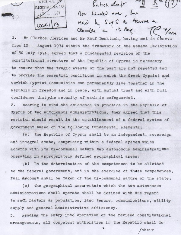 (Above a page from the last of James Callaghan’s drafts 13.8.1974 to secure acceptance from Clerides at Geneva II for a geographical federation).