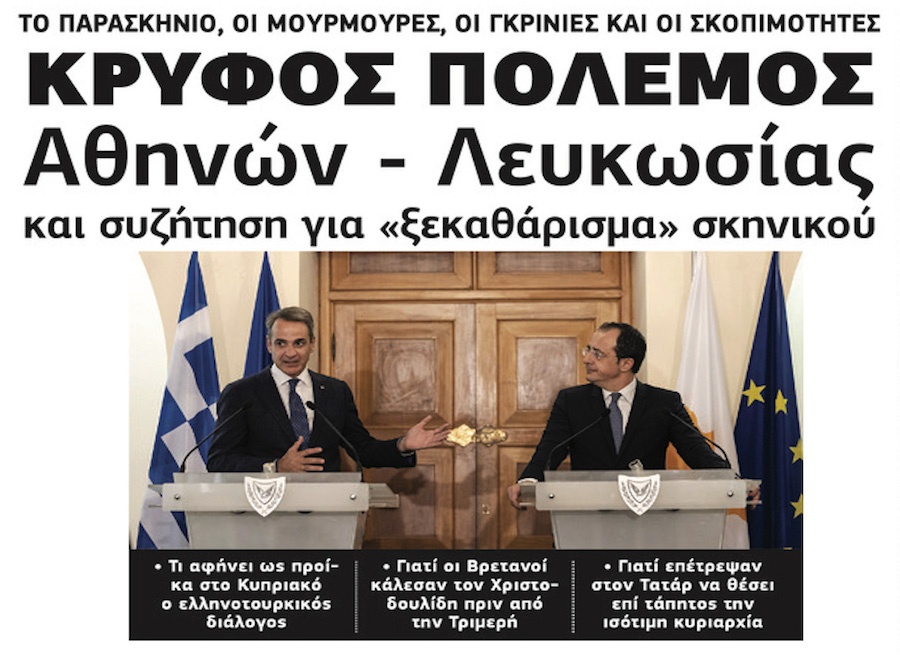 2) Αντιλαμβάνεται ότι η Κυβέρνηση Μητσοτάκη θεωρεί «μπελά το Κυπριακό» και εμπόδιο στα Ελλαδοτουρκικά, εξ ου και η αποσύνδεσή του, η οποία δεν είχε αρέσει αρχικά στη Λευκωσία και στον ίδιο τον Πρόεδρο. Γι’ αυτό, άλλωστε, ελέγετο στο παρασκήνιο η φράση, «τι να κάνουμε, να συγκρουστούμε με την Αθήνα;». Αυτό, βεβαίως, δεν συνέβη, παρότι οι διαφορές συνεχίζονται. Και οι διαφορές αυτές εμφανίζονται ως παράπονα και εκνευρισμός, ο οποίος αποκρύβεται κάτω από επικοινωνιακές δηλώσεις αντιφατικού χαρακτήρα. Ενώ, για παράδειγμα, γινόταν λόγος από τον Πρόεδρο για διαφορετικές προσεγγίσεις με συνέντευξή του στην Αθήνα, από την άλλη αναφέρθηκε μετά την τελευταία συνάντησή του με τον Έλληνα Πρωθυπουργό, ότι υπάρχει κοινός βηματισμός. Και λίγες μέρες αργότερα άρχισε νέα μουρμούρα για τις κινήσεις των Αθηνών, χωρίς επαρκή έστω συνεννόηση με τη Λευκωσία.