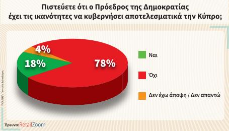 Πλήρως απογοητευμένοι είναι οι πολίτες από τον Πρόεδρο της Δημοκρατίας, ενώ τα ποσοστά του διολισθαίνουν ακόμη περισσότερο σε σχέση με τη διαδικτυακή έρευνα που έγινε από τη RetailZoom για τον «Πολίτη» τον Αύγουστο. Από το 60% των απογοητευμένων πολιτών πλέον έχουμε ένα σχεδόν 70% που δεν είναι ικανοποιημένο από τον τρόπο που διακυβερνά τη χώρα. Οι πολίτες δεν θεωρούν πως ο Πρόεδρος έχει ικανούς συμβούλους δίπλα του, καθώς το 84% των ερωτηθέντων απαντά αρνητικά στο κατά πόσον έχει δίπλα του τους ικανούς. Οι Κύπριοι θεωρούν πως ορθώς παύθηκαν αρχηγός και υπαρχηγός μετά την απόδραση του ισοβίτη, θεωρούν ωστόσο πως θα έπρεπε να παραιτηθεί και ο υπουργός Δικαιοσύνης Μάριος Χαρτσιώτης. Σε σχέση με την αντιπολίτευση, δίνουν υψηλή βαθμολογία στην Αννίτα ως πρόεδρου της Βουλής και του ΔΗΣΥ, θεωρούν ωστόσο πως ο ΔΗΣΥ πατάει σε δύο βάρκες, αφού είναι και συμπολίτευση και αντιπολίτευση μαζί, ενώ κρίνουν υποτονική την αντιπολίτευση του ΑΚΕΛ.