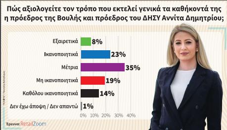 Θετικό πρόσημο δίνουν οι πολίτες, δηλαδή μέτρια προς ικανοποιητικά αξιολογούν τον τρόπο που εκτελεί τα καθήκοντά της η πρόεδρος της Βουλής και πρόεδρος του ΔΗΣΥ Αννίτα Δημητρίου. Η πλάστιγγα γέρνει προς το θετικό για την Αννίτα, αφού το 23% θεωρεί πως εκτελεί τα καθήκοντά της ικανοποιητικά, το 8% θετικά και το 35% μέτρια. Έχει όμως και 33% αρνητικές γνώμες με το 14% να την κρίνει καθόλου ικανοποιητικά και μη ικανοποιητικά το 19%. Εκείνους που πρέπει να πείσει περισσότερο η Αννίτα είναι άτομα ηλικίας 18-34 αφού της δίνουν περισσότερες αρνητικές ψήφους παρά θετικές. Σε σχέση με τον Αύγουστο του 2024, το κοινό έχει πλέον καλύτερη γνώμη για την Αννίτα, μειώνοντας τις αρνητικές γνώμες και αυξάνοντας τις μέτριες και θετικές.