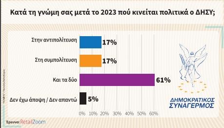 Πού κινείται τελικά ο ΔΗΣΥ μετά το 2023; Μπορεί το κόμμα να διατείνεται πως είναι αντιπολίτευση, το 61% των πολιτών ωστόσο θεωρεί πως πατάει και στις δύο βάρκες. Και είναι εντυπωσιακό πως έχουν το ίδιο μερίδιο και οι δύο πολιτικές θέσεις, αφού το 17% θεωρεί πως ο Συναγερμός είναι αντιπολίτευση και ένα άλλο 17% πως είναι συμπολίτευση. Ένα 5% δεν απάντησε στο σχετικό ερώτημα.