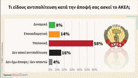 Πρόβλημα στον τρόπο που ασκεί την αντιπολίτευση το ΑΚΕΛ εντοπίζει το κοινό. Το 58% των ερωτηθέντων θεωρεί πως η αντιπολίτευσή του είναι υποτονική, ενώ υπάρχει και ένα σημαντικό μερίδιο 16% που θεωρεί πως δεν ασκεί αντιπολίτευση το κόμμα της Αριστεράς. Υπάρχει αντίθετα ένα 22% που έχει θετική γνώμη για την κριτική που ασκεί στην κυβέρνηση το ΑΚΕΛ με το 14% να τη θεωρεί εποικοδομητική και το 8% να τη χαρακτηρίζει δυναμική.
