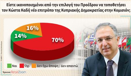 Δεν άρεσε η επιλογή του Προέδρου να τοποθετήσει τον Κώστα Καδή νέο επίτροπο της Κυπριακής Δημοκρατίας στην Κομισιόν. Το 70% των ερωτηθέντων απάντησε πως δεν είναι ικανοποιημένο από την επιλογή του Προέδρου. Μόλις ένα 14% απάντησε θετικά στο ερώτημα, ενώ είναι εντυπωσιακό πως το μερίδιο είναι μικρότερο από αυτούς που απάντησαν πως δεν έχουν άποψη ή δεν ήθελαν να απαντήσουν (16%).