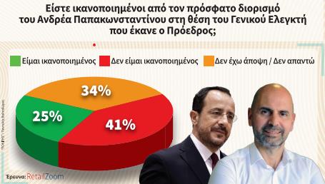 Πίστωση χρόνου φαίνεται να δίνουν οι πολίτες στον νέο Γενικό Ελεγκτή Ανδρέα Παπακωνσταντίνου. Ένα 41% απαντάει μεν αρνητικά στο ερώτημα αν είναι ικανοποιημένοι από τον διορισμό που έκανε ο Πρόεδρος, ωστόσο υπάρχει ένα 34% που απαντάει δεν έχω άποψη/δεν απαντώ, αφού θέλει να δει πρώτα το έργο του και μετά να τον κρίνει. Ένα 25% θεωρεί σωστή την επιλογή διορισμού του Προέδρου.