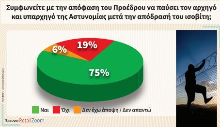 Ορθή ήταν η απόφαση του Προέδρου να παύσει τον αρχηγό και τον υπαρχηγό της Αστυνομίας μετά το περιστατικό της απόδρασης του ισοβίτη. Το 75% απαντάει πως συμφωνεί με την απόφαση του Προέδρου να τους θέσει εκτός σώματος. Μόλις το 19% απαντάει πως δεν συμφωνεί με την απόφαση του Προέδρου, μερίδιο που το αντλεί περισσότερο από άτομα ηλικίας 55 ετών και άνω. Υπάρχει και ένα 6% των πολιτών που δεν είχε άποψη για το θέμα.