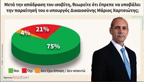 Καθολική ήταν η απάντηση των πολιτών κατά πόσον έπρεπε να παραιτηθεί ο υπουργός Δικαιοσύνης Μάριος Χαρτσιώτης. Το 75% θεωρεί πως έπρεπε να υποβάλει την παραίτησή του μετά την απόδραση του ισοβίτη. Ένα 21% θεωρεί πως ορθώς έμεινε στη θέση του ο υπουργός. Από τα ευρήματα της δημοσκόπησης στις ηλικιακές ομάδες, το ερώτημα δίχασε τις ηλικίες 18-24, αφού μόλις το 55% θεωρεί πως έπρεπε να παραιτηθεί ενώ ένα 32% απάντησε αρνητικά.