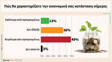 Ζορίζονται οικονομικά οι πολίτες και μάλιστα η κατάστασή τους χειροτερεύει. Στο ερώτημα πώς θα χαρακτήριζαν την οικονομική τους κατάσταση σήμερα, ένας στους δύο πολίτες θεωρεί πως είναι χειρότερη από προηγουμένως, ενώ το 36% θεωρεί πως δεν άλλαξε. Το 13% πάει καλά οικονομικά και θεωρεί πως είναι σε καλύτερη μοίρα.