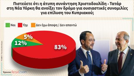 Η στασιμότητα στο Κυπριακό και η σωρεία συνομιλιών που δεν έφεραν ποτέ τη λύση δεν δίνουν ελπίδες στους πολίτες πως θα ξεκλειδώσει η διαδικασία. Γι’ αυτό και το 83% των πολιτών θεωρεί πως η συνάντηση στη Νέα Υόρκη δεν θα ανοίξει τον δρόμο για ουσιαστικές συνομιλίες για επίλυση. Ένα 12% απαντάει θετικά. Περισσότερο απογοητευμένοι είναι τα άτομα ηλικίας 65 ετών και άνω.