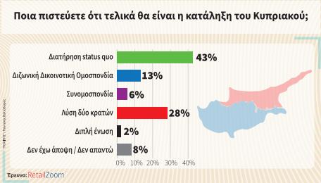 Ποια θα είναι η κατάληξη του Κυπριακού; Στους ερωτηθέντες δόθηκαν συγκεκριμένες επιλογές. Τι απάντησαν; Το μεγαλύτερο ποσοστό (43%) πιστεύει ότι θα διατηρηθεί το status quo, ενώ το 28% θεωρεί πως θα πάμε σε λύση δύο κρατών. Ένα 13% απαντά πως η κατάληξη θα είναι η διζωνική δικοινοτική ομοσπονδία, τη συνομοσπονδία προκρίνει το 6% και τη διπλή ένωση το 2%. Στη λύση δύο κρατών δίνουν περισσότερες ψήφους άτομα ηλικίας 25-44, στη διατήρηση του status quo άτομα ηλικίας 55 και άνω, ενώ τη ΔΔΟ θα ήθελαν περισσότερο οι 18-24.