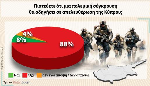 Καθολικά όχι στον πόλεμο λένε οι Κύπριοι πολίτες. Στο ερώτημα αν πιστεύουν πως μια πολεμική σύγκρουση θα οδηγήσει σε απελευθέρωση της Κύπρου, το 88% των ερωτηθέντων απαντάει αρνητικά. Μόλις το 8% απαντά θετικά, ενώ υπάρχει και ένα 4% που δεν απάντησε στο ερώτημα. Μόνο οι ηλικίες 25-34 έδωσαν θετική γνώμη στο σχετικό ερώτημα, ενώ στους 18-24 η αρνητική απάντηση ξεπέρασε το 90%.