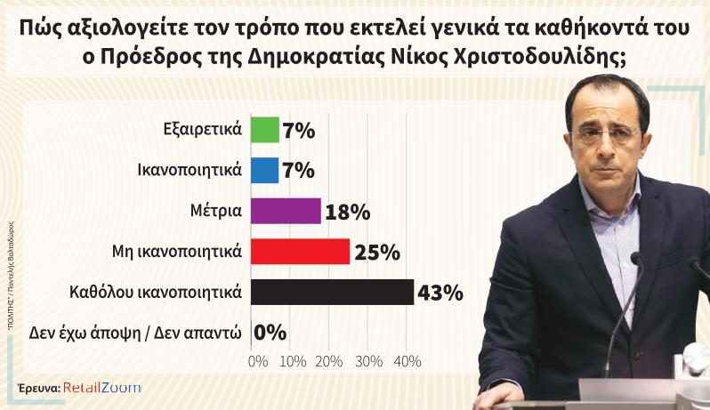 Απογοητευτική εξακολουθεί να είναι η εικόνα που έχουν οι πολίτες για τον τρόπο που εκτελεί τα καθήκοντά του ο Πρόεδρος της Δημοκρατίας Νίκος Χριστοδουλίδης. Στο σχετικό ερώτημα πώς αξιολογούν τα καθήκοντά του, το 68% των ερωτηθέντων δίνει αρνητικό πρόσημο στον Πρόεδρο. Μέτρια τον κρίνει ένα 18% ενώ από ικανοποιητικά έως εξαιρετικά τον κρίνει ένα 14%. Τη μεγαλύτερη απογοήτευση από τον Πρόεδρο νιώθουν οι 18-34 που το ποσοστό αρνητικότητας αγγίζει το 76%.