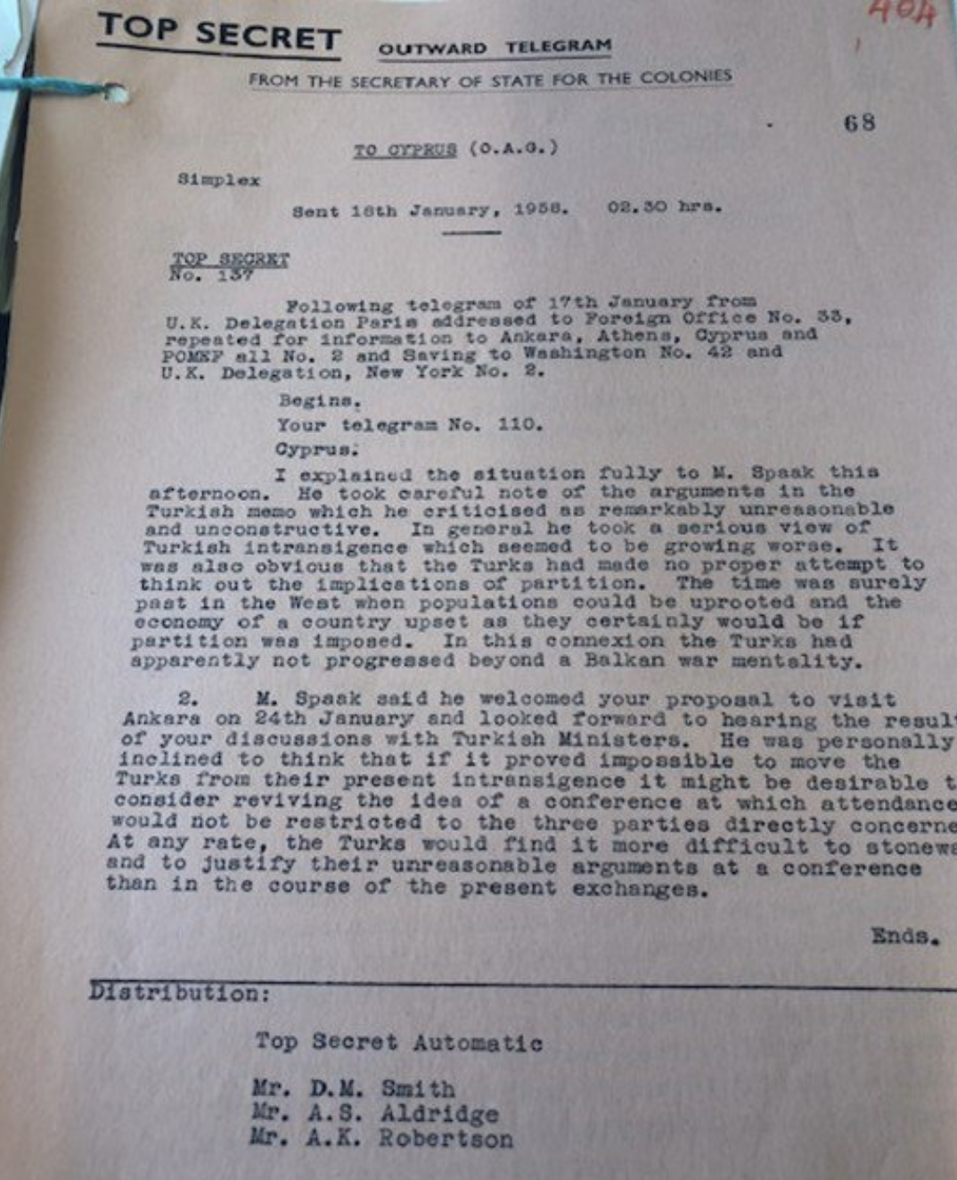 Ιανουάριος 1958. Άκρως εμπιστευτικό Τηλεγράφημα από τον Υπουργό Αποικιών από την βρετανική αντιπροσωπεία στο Παρίσι προς το Φόρειν ΄Οφις και λοιπούς, ενημέρωνε για την αντίδραση του ΓΓ του ΝΑΤΟ Paul Henry Spaak όταν τον ενημέρωσαν για την επιμονή της Τουρκίας για διχοτόμηση. Τους είπε ότι «οι Τούρκοι δεν είχαν κάνει καμία σοβαρή προσπάθεια να σκεφθούν τις επιπτώσεις διχοτόμησης. Ήταν σίγουρα ξεπερασμένος ο καιρός στη Δύση όπου πληθυσμοί μπορούσαν να ξεριζώνονται και η οικονομία μιας χώρας να διαταράττεται όπως σίγουρα θα γίνει αν επιβληθεί διχοτόμηση. Γι΄αυτό οι Τούρκοι ενδεικτικά δεν είχαν προοδεύσει πέραν της βαλκανικής πολεμικής των νοοτροπίας».