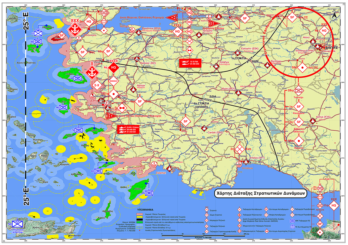 Ο χάρτης αυτός καταδεικνύει: 1) Τον τουρκικό στόχο για διχοτόμηση του Αιγαίου στον 25ο Μεσημβρινό, 2) την αμφισβήτηση της κυριαρχίας των ελληνικών νησιών, 3) την παρουσία των τουρκικών ενόπλων δυνάμεων και την ισχύ τους εάν η Ελλάδα δεχτεί την τουρκική αξίωση περί αποστρατιωτικοποίησης των νησιών του Αιγαίου, που θα δημιουργήσει συνθήκες ανάλογες -αν όχι χειρότερες- με αυτές της αποχώρησης της Ελληνικής Μεραρχίας από την Κύπρο το 1967. Η γραμμή αμύνης της Ελλάδος θα περάσει από τα νησιά στον ηπειρωτικό χώρο, τα δε νησιά θα είναι βορά στις ορέξεις του τουρκικού στρατού και εργαλείο διπλωματικών εκβιασμών.