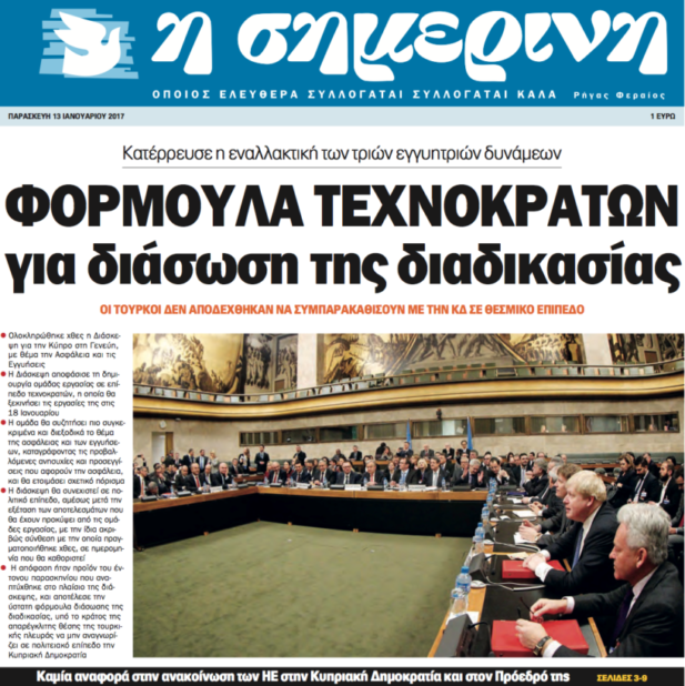 Πάντως, το όλο σκηνικό, όπως διαμορφώθηκε, φαίνεται να επιβεβαιώνει το κυριακάτικο πρωτοσέλιδο της «Σημερινής», σύμφωνα με το οποίο θα επεχειρείτο να στηθεί στη διάσκεψη ένα σκηνικό με απούσα την Κυπριακή Δημοκρατία, έπειτα από επίμονη απαίτηση της Άγκυρας, η οποία αποκλείει a priori τη συμμετοχή της Λευκωσίας στις διεργασίες για την ασφάλεια.