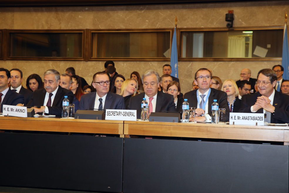 «Η Διάσκεψη για την Κύπρο συγκλήθηκε σήμερα, 12 Ιανουαρίου 2017, στη Γενεύη, υπό την αιγίδα του ΓΓ του ΟΗΕ, με τη συμμετοχή του Εξοχότατου Μουσταφά Ακιντζί και του Εξοχότατου Νίκου Αναστασιάδη, των ΥΠΕΞ της Ελλάδας, της Τουρκίας και του Ηνωμένου Βασιλείου ως εγγυητριών δυνάμεων και στην παρουσία της Ευρωπαϊκής Ένωσης ως παρατηρητού.