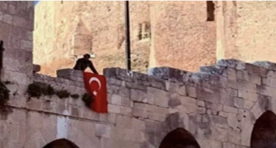 Τζιχαντιστές αναρτούν την τουρκική σημαία στο κάστρο του Χαλεπίου.