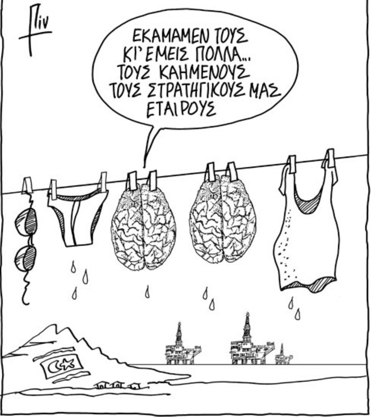– Όχι μόνον δεν αποσύρω στρατό και εποίκους, και επιμένω σε διαιώνιση της παρουσίας τους για λόγους… εγγύησης και… ασφάλειας, αλλά διεκδικώ και επέκταση των κατεχόμενων περιοχών.